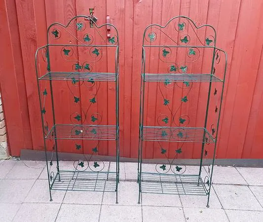 2 vintage 1950 s-style green metal wire collapsible etageres that feature scrolling ivy leaves, arched tops, and 3 shelves that you can use for plants or whatever you want to display or store. Great for the patio, porch, sunroom, greenhouse, or garage. Both stands are in excellent conditionno damageand have dimensions of 20.5 W x 10 D x 53 H. NOTE: Price is for both stands. Not selling separately. ** I prefer text messages 214-494-0595