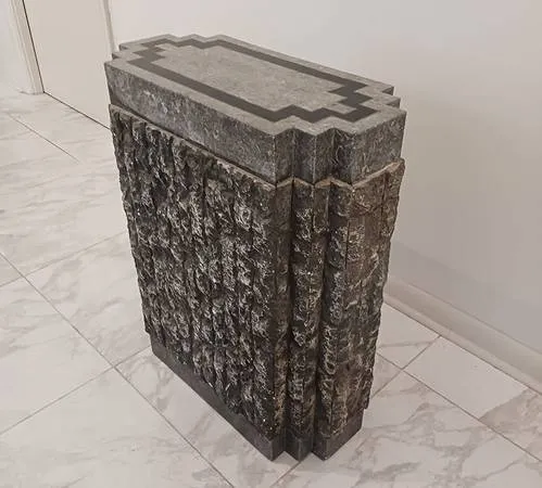 Exquisite postmodern and Brutalist-influenced pedestal from Magnussens 1991 Presidential Collection that features hand-tesselated fossil st 1 with a polished speckled gray top that has black and brass geometric inlays. Perfect accent for modern, eclectic, or minimalist spaces. Can be used as a plant stand, side table, lamp base, or sculptural display. Labeled and dated for authenticity. Originally purchased from Havertys Furniture in the early 90 s. In excellent vintage condition with only light signs of wear. No damage. Dimensions: 23 W x 11 D x 28 H. NOTE: This pedestal is part of a matching set of 3 vintage pedestals Im selling from Magnussens Presidential Collectionsee group photo. Each pedestal is posted and priced separately but I will discount if youre interested in the full set. ** I prefer text messages 214-494-0595
