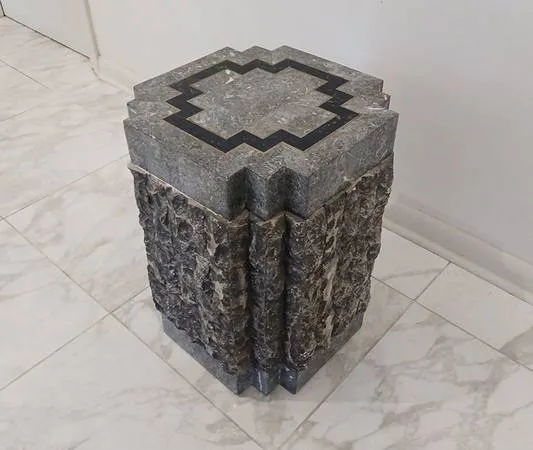 Exquisite postmodern and Brutalist-influenced pedestal from Magnussens 1991 Presidential Collection that features a speckled gray st 1 top with black and brass geometric inlays over a faceted tessellated st 1 base. Perfect accent for modern, eclectic, or minimalist spaces. Can be used as a plant stand, side table, lamp base, or sculptural display. Labeled and dated for authenticity. In excellent vintage condition with only light signs of wear. No damage. Dimensions: 15.5 W x 15.5 D x 15 H. NOTE: This pedestal is part of a matching set of 3 vintage pedestals Im selling from Magnussens Presidential Collectionsee group photo. Each pedestal is posted and priced separately but I will discount if youre interested in the full set. ** I prefer text messages 214-494-0595