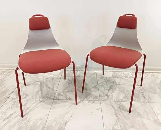 Pair of brand new very fun Mid-Century Modern inspired molded shell lounge chairs in a striking reddish orange colorpaprikathat have a 15-degree backrest tilt and are crafted with a smooth off-white polypropylene shell, plush polyester-padded cushions, steel legs, and a carry handle. The chairs bring retro charm and bold color to living rooms, dining rooms, or offices. Dimensions: 20.5 W x 20.75 D x 32 H with a seat h 8 of around 19. ** I prefer text messages 214-494-0595
