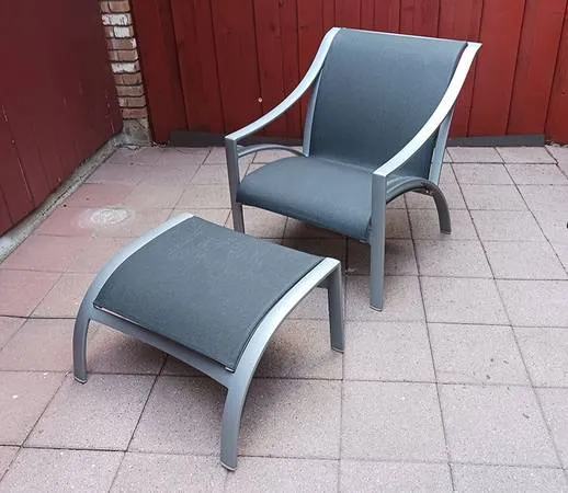 High-end luxury Brown Jordan lounge armchair and ottoman from the Pasadena line. This mid-century modern set, designed by John Caldwell, is crafted with premium aluminum silver frames and weather-resistant slate grey sling fabric. The lounge chair retails new for over $1,400 while the ottoman retails for around $800. Perfect for upscale patios, porches, or poolside lounging. Both the chair and ottoman are in excellent condition with no frame scratches and no rips or stains on the sling fabric. Only blemishminoris the ottoman has some light scratches on the sling fabric. DIMENSIONS: Chair 28.25 W x 33.5 D x 34 H with a seat h 8 of 16 Ottoman 27 W x 24 D x 16 H. ** I prefer text messages 214-494-0595