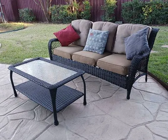 Gently used 3-seat outdoor conversation set in classic black resin wicker that features a 6 ft sofa couch with cushions/pillows and a matching coffee table with tempered glass top and lower wicker shelf. The set is in excellent overall condition. The seat cushions are brand new from Sunbrella. The back cushions are older and show light wear but dont have any holes or tears. Sofa dimensions: 74 L x 30 D x 36 H. ** I prefer text messages 214-494-0595
