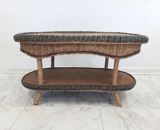 Charming mid-century boho wicker rattan coffee table with that perfect coastal/organic modern vibe. 2-tier oval design with wrapped sage-green and burgundy trim, super tight weave, and no sag. Measures 37 L × 20 D × 18 H. ** I prefer text messages 214-494-0595