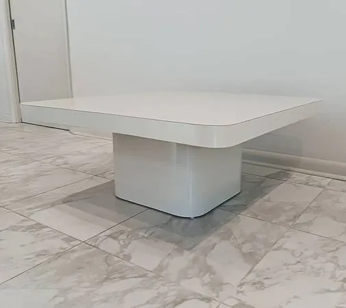 Exquisite mid-century modern coffee table, circa 1970 s, that boasts a sleek glossy ivory laminate top and sculptural pedestal base. Perfect for retro or contemporary spaces. In excellent condition with very few blemishes. Dimensions: 36 W x 36 D x 15.5 H. ** I prefer text messages 214-494-0595