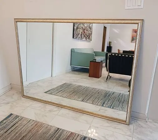 This magnificent vintage Hollywood Regency gold-leaf mirror originated in a Preston Hollow estate and has been in storage for 40 yearssince the mid 1980 s. An absolute time-capsule piece. The mirror measures 66 W x 48 H x 1 D and features a cast aluminum frame-front on solid wood backing, gorgeous hand-applied champagne gold leaf, deep fluted sides, beaded inner edge, and perfect antiqued patina. The back of the mirror has the original Kraft paper dust cover and a double heavy duty wire for hanging. Perfect mirror for floor-leaning, entryway, bedroom, or living room. Glass is flawless with no cracks or scratches. There are a few tiny age specks but this is completely normal for vintage mirrors this old and theyre barely noticeable. This mirror is the exact high-end showroom styleLa Barge, John-Richard, etc.that originally retailed for $1,500$2,500 and inspired today’s $2,000 Anthropologie/Arhaus versions. NOTE: Bring help and a vehicle large enough to transport the mirrorits big and heavy! ** I prefer text messages 214-494-0595