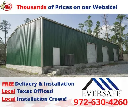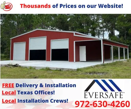 A Commercial Steel building with multiple openings is perfect for warehouses, distribution centers, storage facilities, commercial retail store fronts and more. Choose from different dimensions and colors to suit your needs. 150 to 180 mph Texas certification. FREE DELIVERY and FREE INSTALLATION is included with every building. Contact Us for Special Pricing!!! ---------------------------------------- phone #: 972-630-4260 TexasBuildings&Pricing: https://www.eversafebuildings.com/garage-buildings-texas/Copy & Paste in your Browser Keep it local with a Texas based manufacturer and construction crews. We offer quality you can trust backed by our 100 Satisfaction Guarantee and a 1 Year Workmanship Warranty against defects. We have an A+ BBB rating and thousands of satisfied customers. Our customers’ complete satisfaction is important to us on every job. Ask about our Sale and Save $$$$$$ on these available Commercial Steel building models. Commercial Steel Buildings: 30 x 80, 30 x 90, 40 x 80, 30 x 100, 40 x 100, 50 x 100 & 60 x 120 To move forward with your building purchase call 972-630-4260 to speak to 1 of our Commercial building estimators or you can email us online at buildingestimating at eversafebuildings.com. Multi-bay storage building, metal garages, garage buildings, storage buildings, steel buildings, metal RV storage buildings, metal RV garage buildings, metal RV shelters, metal garage kits, metal barns, metal sheds, residential metal buildings, steel garage building kit, workshop steel building, prefab building kit, garage kits, hurricane buildings, pole barn, pole building, Texas Metal Garages. Commercial Steel Buildings