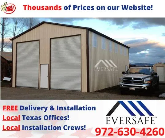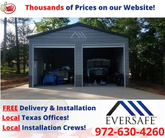 A 2-bay building is the perfect solution if you’re looking for a multi-purpose prefab garage or storage building. You can store a car in 1 bay and work in the other. Choose from many different colors for the roof, walls and trim and wall h 8 s up to 18. FREE DELIVERY and FREE INSTALLATION is included with every building. Contact Us for Special Pricing!!! ---------------------------------------- phone # 972-630-4260 TexasBuildings&Pricing: https://www.eversafebuildings.com/garage-buildings-texas/Copy & Paste in your Browser Keep it local with a Texas based manufacturer and construction crews. We offer quality you can trust backed by our 100 Satisfaction Guarantee and a 1 Year Workmanship Warranty against defects. We have an A+ BBB rating and thousands of satisfied customers. Our customer’s complete satisfaction is important to us on every job. Ask about our Sale and Save $$$$$$ on these available 1, 2 and 3 car garage building models. 1 Car Garage: 18 x 20, 18 x 25 2 Car Garage: 20 x 25, 24 x 25 3 Car Garage: 24 x 30, 30 x 30 Garage/Workshop: 30 x 40, 30 x 50,40 x 40, 40 x 60 To move forward with your building purchase call 972-630-4260 to speak to 1 of our garage estimators or you can email us online at buildingestimating at eversafebuildings.com. Multi-bay storage building, metal garages, garage buildings, storage buildings, steel buildings, metal RV storage buildings, metal RV garage buildings, metal RV shelters, metal garage kits, metal barns, metal sheds, residential metal buildings, steel garage building kit, workshop steel building, prefab building kit, garage kits, hurricane buildings, pole barn, pole building, Texas Metal Garages.