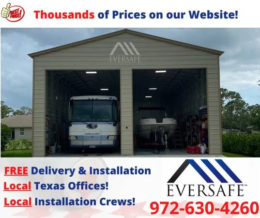 An RV storage building with an open end wall is a great way to protect your recreational vehicle, motorhome or any other type of vehicle. It allows easy access without having to open a roll up door. Choose from different dimensions and colors to suit your needs. 150 to 180 mph Texas certification. FREE DELIVERY and FREE INSTALLATION is included with every building. Contact Us for Special Pricing!!! ---------------------------------------- phone #: 972-630-4260 TexasBuildings&Pricing: https://www.eversafebuildings.com/garage-buildings-texas/Copy & Paste in your Browser Keep it local with a Texas based manufacturer and construction crews. We offer quality you can trust backed by our 100 Satisfaction Guarantee and a 1 Year Workmanship Warranty against defects. We have an A+ BBB rating and thousands of satisfied customers. Our customers’ complete satisfaction is important to us on every job. Ask about our Sale and Save $$$$$$ on these available RV Storage building models. 1 Car Garage: 18 x 20, 18 x 25 2 Car Garage: 20 x 25, 24 x 25 3 Car Garage: 24 x 30, 30 x 30 RV Storage Building: 30 x 40, 30 x 50, 30 x 60, 40 x 40, 40 x 60 To move forward with your building purchase call 972-630-4260 to speak to 1 of our garage estimators or you can email us online at buildingestimating at eversafebuildings.com. Multi-bay storage building, metal garages, garage buildings, storage buildings, steel buildings, metal RV storage buildings, metal RV garage buildings, metal RV shelters, metal garage kits, metal barns, metal sheds, residential metal buildings, steel garage building kit, workshop steel building, prefab building kit, garage kits, hurricane buildings, pole barn, pole building, Texas Metal Garages.