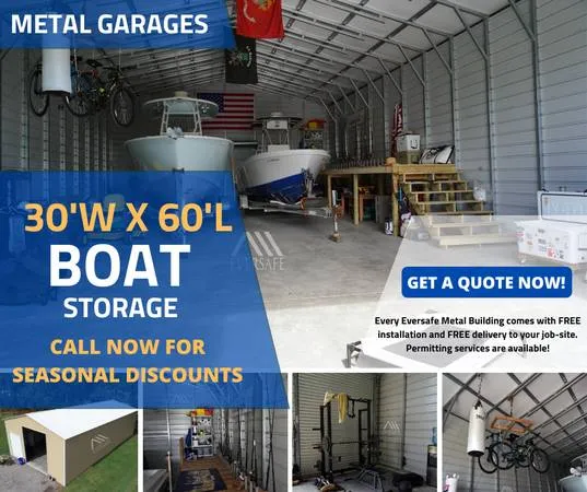 Our large span boat storage buildings are perfect for multiple boats, personal watercraft, wave runners, yachts and more. Choose from different dimensions and colors to suit your needs. 150 to 180 mph Texas certification. FREE DELIVERY and FREE INSTALLATION is included with every building. Contact Us for Special Pricing!!! ---------------------------------------- phone #: 972-630-4260 TexasBuildings&Pricing: https://www.eversafebuildings.com/garage-buildings-texas/Copy & Paste in your Browser Keep it local with a Texas based manufacturer and construction crews. We offer quality you can trust backed by our 100 Satisfaction Guarantee and a 1 Year Workmanship Warranty against defects. We have an A+ BBB rating and thousands of satisfied customers. Our customers’ complete satisfaction is important to us on every job. Ask about our Sale and Save $$$$$$ on these available Boat Storage building models. Boat Storage Buildings: 30 x 40, 30 x 60, 40 x 60, 50 x 60, 30 x 80, 30 x 90, 40 x 80, 30 x 100, 40 x 100, 50 x 100 & 60 x 120 To move forward with your building purchase call 972-630-4260 to speak to 1 of our building estimators or you can email us online at buildingestimating at eversafebuildings.com. Multi-bay storage building, metal garages, garage buildings, storage buildings, steel buildings, metal RV storage buildings, metal RV garage buildings, metal RV shelters, metal garage kits, metal barns, metal sheds, residential metal buildings, steel garage building kit, workshop steel building, prefab building kit, garage kits, hurricane buildings, pole barn, pole building, Texas Metal Garages. Boat Storage Buildings.