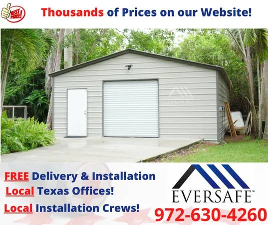 This Texas steel garage offers a variety of uses and make a great addition to your home or business. You can customize your garage dimensions and building colors. FREE DELIVERY and FREE INSTALLATION is included with every building. Contact Us for Special Pricing!!! ---------------------------------------- phone #: 972-630-4260 TexasBuildings&Pricing: https://www.eversafebuildings.com/garage-buildings-texas/Copy & Paste in your Browser Keep it local with a Texas based manufacturer and construction crews. We offer quality you can trust backed by our 100 Satisfaction Guarantee and a 1 Year Workmanship Warranty against defects. We have an A+ BBB rating and thousands of satisfied customers. Our customers’ complete satisfaction is important to us on every job. Ask about our Sale and Save $$$$$$ on these available 1, 2 and 3 car garage building models. 1 Car Garage: 18 x 20, 18 x 25 2 Car Garage: 20 x 25, 24 x 25 3 Car Garage: 24 x 30, 30 x 30 Garage/Workshop: 30 x 40, 30 x 50 To move forward with your building purchase call 972-630-4260 to speak to 1 of our garage estimators or you can email us online at buildingestimating at eversafebuildings.com. Multi-bay storage building, metal garages, garage buildings, storage buildings, steel buildings, metal RV storage buildings, metal RV garage buildings, metal RV shelters, metal garage kits, metal barns, metal sheds, residential metal buildings, steel garage building kit, workshop steel building, prefab building kit, garage kits, Texas Metal Garages.