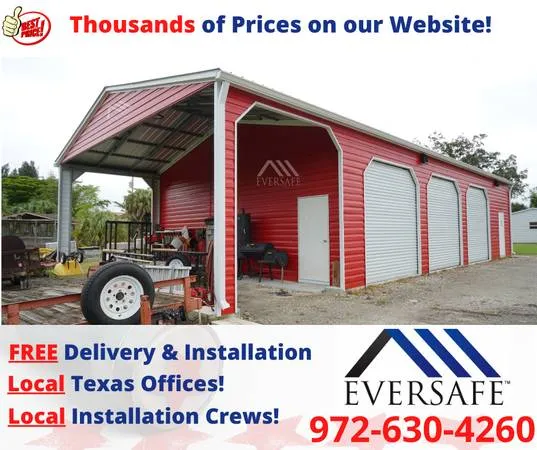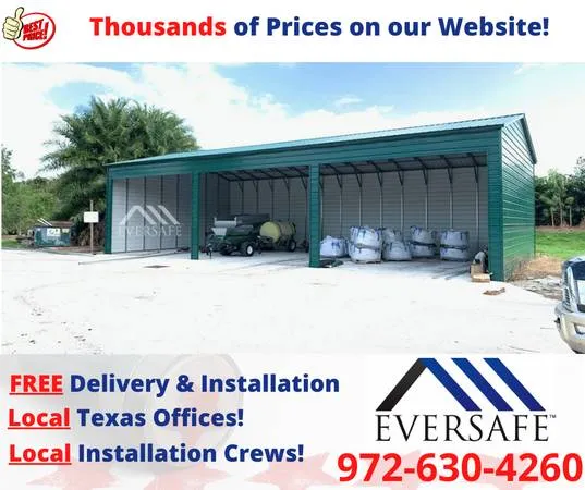 This 3 sided detached garage allows for storage of cars or large equipment. The open end allows for easy access without having to open any doors. Texas code approved up to 180 mph, you can choose from multiple colors for the roof, walls and trim. FREE DELIVERY and FREE INSTALLATION is included with every building. Contact Us for Special Pricing!!! ---------------------------------------- phone #: 972-630-4260 TexasBuildings&Pricing: https://www.eversafebuildings.com/garage-buildings-texas/Copy & Paste in your Browser Keep it local with a Texas based manufacturer and construction crews. We offer quality you can trust backed by our 100 Satisfaction Guarantee and a 1 Year Workmanship Warranty against defects. We have an A+ BBB rating and thousands of satisfied customers. Our customer’s complete satisfaction is important to us on every job. Ask about our Sale and Save $$$$$$ on these available 1, 2 and 3 car garage building models. 1 Car Garage: 18 x 20, 18 x 25 2 Car Garage: 20 x 25, 24 x 25 3 Car Garage: 24 x 30, 30 x 30 Garage/Workshop: 30 x 40, 30 x 50 To move forward with your building purchase call 972-630-4260 to speak to 1 of our garage estimators or you can email us online at buildingestimating at eversafebuildings.com. Multi-bay storage building, metal garages, garage buildings, storage buildings, steel buildings, metal RV storage buildings, metal RV garage buildings, metal RV shelters, metal garage kits, metal barns, metal sheds, residential metal buildings, steel garage building kit, workshop steel building, prefab building kit, garage kits, hurricane buildings, pole barn, pole building, Texas Metal Garages.