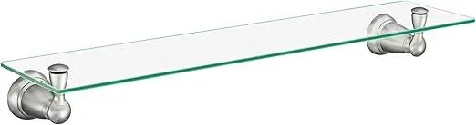 MO EN Banbury 5-4/25 in. L x 3 in. H x 22-3/4 in. W Wall-Mount Clear Glass Shelf in Brushed Nickel. New in the box. Ph/txt 630-362-3169. Traditional style adds a refined touch Tempered glass is less likely to shatter About This Product The MOEN Glass Shelf will instantly complete your bathroom area. This shelf has a zinc fixture, making it a convenient accessory due to its durability and lightw 8 build. Its fixture has a brushed nickel coating, offering enhanced durability with a decorative appearance. It has a glass construction, which gives your bathroom space a larger look. It features a traditional style, which matches with your bathroom, no matter its decor. This shelf has concealed screws and is equipped with mounting hardware, making it a very user-friendly accessory to assemble.