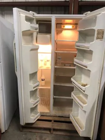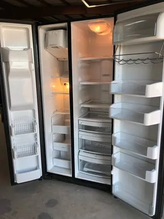 Need a clean, reliable, good working fridge? This is a GE 24.6 Cu Ft PCF 25 MGWA Refrigerator, Side by Side, black. It comes from a smoke free and pet free environment. And its ready to be plugged in and used. Ice maker NOT tested due to lack of water line. Measures 35 Widex 30 Deepx 72 High. Keep your foods cold and frozen with this great working fridge with a total of 24.6 Cubic Feet capacity. Fridge Highlights: ---------------------- - Side-by-Side - All Digital Temperature Control - Dairy Bin - Lighted Inside - Freezer Temperature Control - Ice MarkerNOT TESTED - Good working ConditionFreezer & Fridge Areas - Frost-Free - ClimateKeeper 2 System - TurboCool Feature - Free Standing - Wire Shelves; 3 Baskets - Automatic Defrost - Spill Safe Shelves - Slimfilter Design - Leveling Legs - BrightSpace Interior with GE Lighting If you have any questions, please feel free to ask. You can reach me via text, email or by phone call at the above listed number 214-735-3227. Thank you.