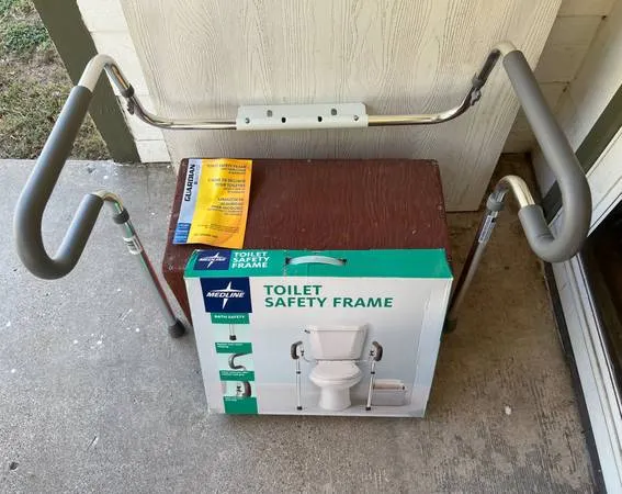 New out of box assembled Medline Guardian Toilet Safety Frame for when assistance is needed for sitting or standing. W 8 capacity 300 lbs. From a smoke free home. $20.00 cash. phone calls only please. 214-886-1088. Thank You!