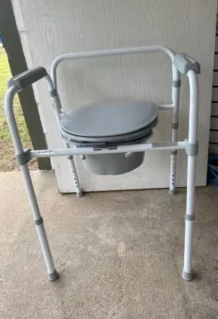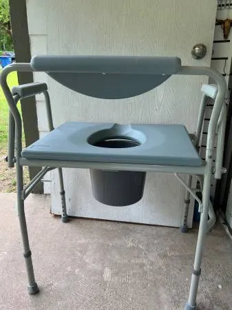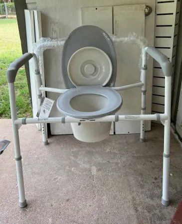 New out of box Guardian 3 in 1 Steel Folding Commode with an Elongated Seat which is more accommodating for male patients. Uses include by bedside, over the bathroom toilet with splash shield and the back bar removed when added h 8 is needed and with just the seat and back in the shower for hygienic cleaning. W 8 capacity 350 lbs. From a smoke free home. $25.00 cashi. 214-886-1088. Thank You!