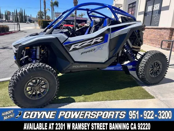 2025 Polaris® RZR Pro R Sport Champion of the Desert Unleash a force of nature with RZR Pro R, our most powerful RZR with race-proven durability. Features may include: A Bold New Design Show up and stand out with the bold new design of RZR Pro R–delivering more and style and performance to win it all. Refined Interior Winning starts from within, and RZR Pro R is no exception. Its interior is meticulously designed with more comfort and convenience, empowering you to ride farther, drive harder and finish in first place. PERFORMANCE Out-thrill them all with an off-road beast designed to dominate. RZR Pro R delivers heart-pounding performance with race-proven comp 1 nts to defy deserts and conquer dunes. Game-Changing Technology Take your ride up a notch with off-road optimized tech. From advanced connectivity to groundbreaking sound, the RZR Pro R features cutting-edge tech to unlock more potential off road. NEW! Fresh Cabin Air Intakes NEW! Guage Cluster with Dual Analog Dials and 4 LCD Screen NEW! 10 Spoke Aluminum 5-lug Wheels 74 Width, 104.5 Wheelbase ProStar Fury 2.0225 HP Engine Pro Performance True 2 WD/4 WD/4 WD Lock MaxLink Suspension with 29 Usable Travel 32 Maxxis® Tires and Aluminum 5-lug Wheels 6-Pt. Retractable Harness Walker Evans® 2.5/3.0 Velocity Needle Shocks COYNE POWERSPORTS 951-922-3200 *Price, if shown, does not include government fees, registration, taxes, A.D.M., dealer document preparation charges, finance charges, or added accessories installed on the unitif applicable. Final actual sales price will vary depending on options or accessories selected. A.D.M. includes but is not limited to inter-store transportation costs, assembly, servicing, dealer insurance, profit & overhead, flooring & other costs where applicable. All vehicles in this ad are subject to prior sale. All Current Manufacturer Promotions and Rebates are included in pricing. Offers expire when promotion ends OR when advertised vehicles are sold. Warning WARNING: Operating, servicing and maintaining a passenger vehicle, an off-highway motor vehicle or a recreational marine vessel can expose you to chemicals including engine exhaust, carbon monoxide, phthalates, and lead, which are known to the State of California to cause cancer and birth defects or other reproductive harm. To minimize exposure, avoid breathing exhaust, do not idle the engine except as necessary, service your vehicle or vessel in a well-ventilated area and wear gloves or wash your hands frequently when servicing your vehicle or vessel. For more information go to https://www.p 65 warnings.ca.gov/products/passenger-vehicle and https://www.p 65 warnings.ca.gov/products/marine.