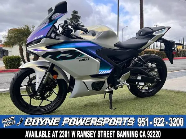 2025 Yamaha YZF-R 3 R WORLD IS CALLING New generation R-Series styling, advanced twin cylinder engine and ultra-light chassis—the perfect entry into R World. Features may include: New Generation R-Series Styling Inspired by the flowing aerodynamics of Yamahas YZR-M 1 MotoGP® race bike, the new 2025 YZF-R 3 s distinctive R-Series pedigree is recognizable at a glance with its aggressive new front fairing, sleek new side panels and a sporty new tail section with signature R-series tail wing. Modern LED Lighting New LED lighting adds a more modern look, including a new single projector-type headlight flanked by 4-element position lights, along with a new LED tail light and turn signals. Smartphone Connectivity The 2025 YZF-R 3 now features Yamaha Motorcycle ConnectY-Connectsmartphone connectivity which works in conjunction with the free-of-charge Y-Connect appavailable for iOS and Androidto enable a direct connection between motorcycle and smartphone. Y-Connect capability for the R 3 includes the ability to view incoming call, email and message notifications. Additional useful functions include monitoring and notifying the rider or other contact of motorcycle technical issues, and also the ability to track and record key motorcycle ride data within the app, including distance covered, fuel consumption, acceleration, motorcycle location and much more. New LCD Display An all-new LCD instrument cluster now displays connected smartphone information along with vital vehicle data. There is also a new USB-A socket located next to the display providing convenient power for phone charging or heated gear. New Assist & Slipper Clutch A first for the YZF-R 3, the new Assist & Slipper clutch utilizes an assist cam and slipper cam to help inhibit excessive engine braking for a smooth, easy-to-handle feeling during downshifts while also reducing the amount of force required to pull the clutch lever for less hand fatigue. Condition New Availability In Stock Location Banning Stock Number Y 54770 Vin MH 3 RH 25 Y 7 SK 001679 Vehicle Type Motorcycle / Scooter Category Super Sport Color LUNAR WHITE/ NEBULA BLUE COYNE POWERSPORTS 951-922-3200 *Price, if shown, does not include government fees, registration, taxes, A.D.M., dealer document preparation charges, finance charges, or added accessories installed on the unitif applicable. Final actual sales price will vary depending on options or accessories selected. A.D.M. includes but is not limited to inter-store transportation costs, assembly, servicing, dealer insurance, profit & overhead, flooring & other costs where applicable. All vehicles in this ad are subject to prior sale. All Current Manufacturer Promotions and Rebates are included in pricing. Offers expire when promotion ends OR when advertised vehicles are sold. Warning WARNING: Operating, servicing and maintaining a passenger vehicle, an off-highway motor vehicle or a recreational marine vessel can expose you to chemicals including engine exhaust, carbon monoxide, phthalates, and lead, which are known to the State of California to cause cancer and birth defects or other reproductive harm. To minimize exposure, avoid breathing exhaust, do not idle the engine except as necessary, service your vehicle or vessel in a well-ventilated area and wear gloves or wash your hands frequently when servicing your vehicle or vessel. For more information go to https://www.p 65 warnings.ca.gov/products/passenger-vehicle and https://www.p 65 warnings.ca.gov/products/marine.