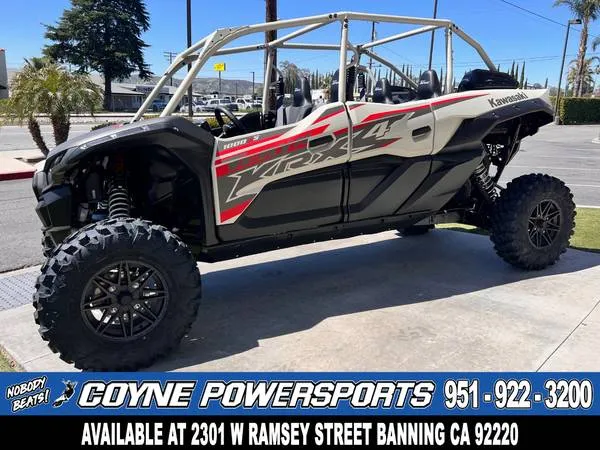 2025 Kawasaki Teryx® KRX 41000 eS Dominate Adventure with more friends and family with 4-passenger seating on the new Teryx® KRX 41000. With an enlarged chassis, no sacrifices were made to accommodate the additional passengers. Advanced suspension technology combined with beefy wheels and tires deliver the ultimate riding experience. The Teryx KRX 41000 reinforces and elevates the reputation of purpose-built Kawasaki sport side x sides. Features may include: CAPABILITY DURABLE AND CAPABLE Take on the great outdoors with the ability to conquer tough terrain while offering superb control and comfort. Soak up technical obstacles with confidence so you can focus on the fun ahead. CONFIDENCE DESIGNED TOUGH Thoughtful design is evident by the burly frame and ROPS, massive suspension comp 1 nts, and extensive undercarriage protection. COMFORT CLASS-LEADING COMFORT Kawasaki engineers placed great emphasis on carefully designing a roomy rear passenger space that is large enough to comfortably accommodate 4 full-sized adults. Thanks to its rugged performance, advanced technology, and superb class-leading comfort, the Teryx® KRX 41000 side x side is ready to take you and your passengers on an adventure for the memory books. ADDITIONAL FOX 2.5 Live Valve Internal Bypass Shocks Kawasaki Electronic Control SuspensionKECS Selectable 3-mode Semi-Active Damping Control 7-in High-Grade, Full-Color TFT Instrumentation with Smartphone Connectivity Condition New Availability In Stock Location Banning Stock Number K 52754 Vin JKARTCA 10 SB 503147 Vehicle Type Utility Vehicle Category Side by Side Color MATTE WHITISH SAND BEIGE/ METALLIC FLAT RAW GRAYST 1 COYNE POWERSPORTS 951-922-3200 *Price, if shown, does not include government fees, registration, taxes, A.D.M., dealer document preparation charges, finance charges, or added accessories installed on the unitif applicable. Final actual sales price will vary depending on options or accessories selected. A.D.M. includes but is not limited to inter-store transportation costs, assembly, servicing, dealer insurance, profit & overhead, flooring & other costs where applicable. All vehicles in this ad are subject to prior sale. All Current Manufacturer Promotions and Rebates are included in pricing. Offers expire when promotion ends OR when advertised vehicles are sold. Warning WARNING: Operating, servicing and maintaining a passenger vehicle, an off-highway motor vehicle or a recreational marine vessel can expose you to chemicals including engine exhaust, carbon monoxide, phthalates, and lead, which are known to the State of California to cause cancer and birth defects or other reproductive harm. To minimize exposure, avoid breathing exhaust, do not idle the engine except as necessary, service your vehicle or vessel in a well-ventilated area and wear gloves or wash your hands frequently when servicing your vehicle or vessel. For more information go to https://www.p 65 warnings.ca.gov/products/passenger-vehicle and https://www.p 65 warnings.ca.gov/products/marine.