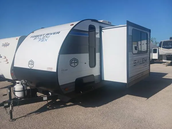 Used 2025 Salem bunkhouse travel trailer, model 178 bhsk, just like new inside and out, all major appliances guaranteed to be working properly, this 1 has a big horseshoe booth slide, 2 rear queen bunks, front Murphy bed, and a couch, it will sleep 8 people and is only 18 ft long, only 4521 lbs. Rear bathroom with good floor space and a stand-up shower, 12 volt 8 cubic foot refrigerator freezer, roof air conditi 1 r, TV mount, power awning with lights, and more! This is a great little unit just like brand new for $16,900, please call for more information, make ready and walk through included, we welcome trades and offers, call or text Joe for your BEST deal, 830-660-7074, thanks. Please call for information on other used and new units we have on the lot.
