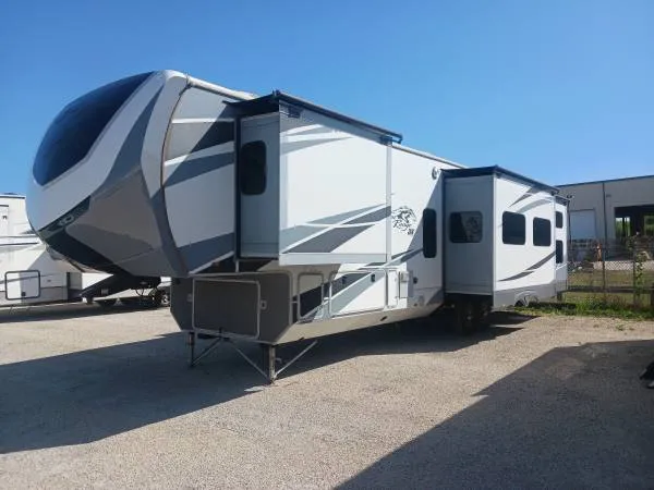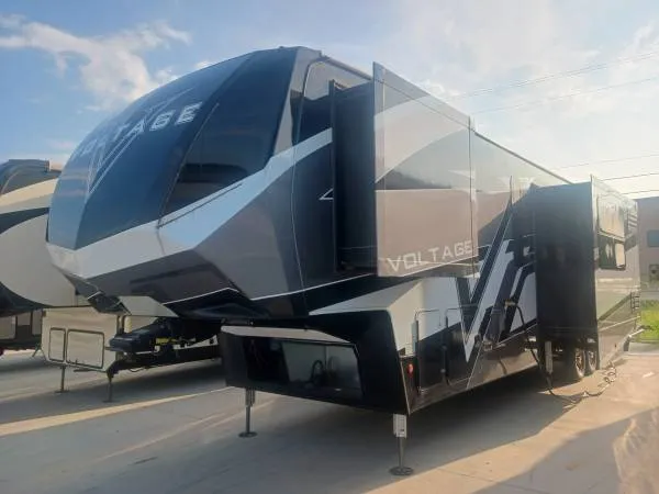 2021 voltage model 4145 fifth wheel toy hauler, all major appliances guaranteed to be working properly this 1 has 3 slides 2 living room slides with a recliner couch across from the 50 inch TV and fireplace, big kitchen with good counter space and 4-door fridge 3 air conditi 1 rs, side bath with stand-up shower front bedroom with closet slide, 12 ft garage with a half bathroom, 2 couch and a ceiling bed, combo washer dryer and extra fridge, this 1 has 3 axles, Auto level, gelcoat fiberglass, big outside kitchen, frameless windows, 2 patio awnings, no generator, all major appliances guaranteed to be working properly full make ready and walk through included, on sale $59,995 we welcome trades and offers, call or text Joe for your BEST deal, 830-660-7074 please call for information on other used and new units we have on the lot thanks JUST LOWRED THE PRICE!!