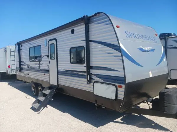 2021 Springdale travel trailer toy hauler, model 27 TH, absolutely pristine condition, no smoke no damages all major appliances guaranteed to be working properly, this 1 will sleep 5 easy, 3 couches and a front Queen walk around bed rear ramp with a patio option with a fence, side kitchen with good countertop space and lots of cabinets, 2 door fridge, microwave and 3 burner stove with oven, 32-in TV and stereo, side bath with big stand up shower, front Queen walk around bed with 2 closets, this is a 50 amp service unit with ducted air conditioning and prep for second AC, large front outside storage, power awning, power tongue jack, and power stabilizers, outside shower, Solid Step entrance, mag wheels, and more, full make ready and walk through included, on sale $19,910, more pictures and information upon request, we welcome trades and offers, call or text Joe for your BEST deal, 830-660-7074 more pictures and information upon request, thanks