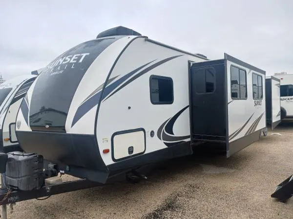 2019 Crossroads Sunset Trail bunkhouse travel trailer, model 336 BH, good condition, all major appliances guaranteed to be working properly, 50 amp service with 2 air conditi 1 rs, 2 slides big living room with booth and couch, side kitchen with a huge pantry and good countertop space big hallway closet for storage, this 1 has a separate rear room that will sleep 6 people, side bath with outside door, front walk around queen bed with 2 hard doors, this 1 is a fiberglass exterior with nice size outside kitchen and big cross through front storage power awning power tongue jack outside shower and a black tank flush, this is a nice unit for $19,900 more pictures and information upon request we welcome trades and offers, call or text Joe for your best deal, 830-660-7074, please call for information on other used and new units we have a lot thanks.