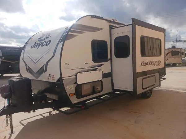 2023 Jayco Jay Feather Micro travel trailer model 199 MBS, like new condition, all major appliances guaranteed to be working properly, these are hard to find, this 1 has an off-road stance with 16 inch Goodyear tires and flared fenders outside kitchen area with an LP drop, backup camera, this 1 has the Climate Shield, good in cold weather, backup camera, factory roof mounted solar panel, fiberglass exterior with aluminum structure, this 1 has a horseshoe booth dinette slide, rear bathroom with stand up shower, 2 double wide rear bunks, side kitchen with 2-door fridge, Murphy bed with a couch up front, this 1 already has a TV thats mounted and is super clean ready to go camping, new they run in the 40 s this 1 on sale $27,900, make ready and walk through included, we welcome trades and offers, make ready and walk through included, call or text Joe for your BEST deal, 830-660-7074, please call for information on other used and new units we have on the lot, we have been a Jayco dealer here for over 35 years, thanks