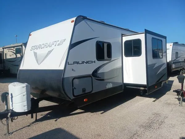 2018 Starcraft Launch model 24 ODK, super nice and clean, no smoke no damage, all major appliances guaranteed to be working properly, this is a fiberglass unit with 1 big slide, will sleep 8 easy, horseshoe Booth dinette in a slide, 2 rear queen bunks, side kitchen with good countertop space and a big pantry, 2 queen rear bunks, great TV location with a mount, front Queen bed with TV already mounted, ducted air conditioning, outside kitchen, power tongue jack, black tank flush and outside shower, aluminum wheels, outside kitchen area, and more! This is a really nice clean unit inside and out ,on sale $16,995, make ready and walk through included we welcome trades and offers, call or text Joe for your BEST deal, 830-660-7074, please call for information on other used and new units we have a lot, right now were loaded with bunkhouse trailers, thanks.