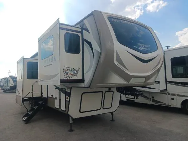 2019 Montana 5 th wheel model 3761 FL, very nice condition, all major appliances guaranteed to be good, this is a big front living room with 5 slides, up front you have 2 couches that both make beds and theater seats that face a 50 inch tv and fireplace, kitchen has a residential fridge, lots of counter and cabinet space, big pantry, and a half bath, bedroom has a king size bed in a slide, huge closets that are prepped for a stackable washer dryer, oversized front bathroom with sit-down shower and lots of countertop space and cabinets, this 1 has a huge outside underbelly storage compartment up front and in the rear, 50 amp service with 2 quiet cool air conditi 1 rs, gel coat fiberglass exterior, frameless windows, power awning, 6 point auto level, outside shower, black tank flush, and more, this is a great full-time unit, Montana has been the number 1 selling fifth wheel in the industry for over 20 years, we are a Montana dealer here and have been for over 15 years, this 1 on sale $49,900, more pictures and information upon request, we welcome trades and offers, call or text Joe for your best deal, 830-660-7074, please call for information on other used and new units we have here on the lot thanks. JUST LOWERED THE PRICE!!