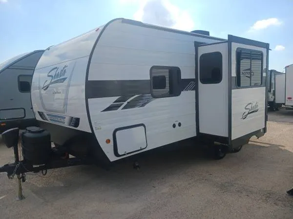 2025 Shasta travel trailer model 20 RB, super nice and clean, this 1 looks absolutely perfect condition, no evidence that its ever even been used, this 1 has hide a bit couch in a slide that faces the TV location, front Queen walk around bed with great storage and closet space, side kitchen with composite countertops and great storage, big 10 cubic foot 12 volt refrigerator, roof air conditi 1 r, huge pantry, rear bath with stand up shower, no carpet anywhere, power awning power tongue jack, on demand water heater, outside shower, black tank blush, cargo rack, and new spare tire, extra large front cross through storage, this unit is absolutely perfect, pristine, inside and out, all major appliances guaranteed to be working properly, walk through and make ready included, on sale $21,900, we welcome trades and offers, call Joe for your BEST deal, 830-660-7074, please call for information on other used and new units that we have on the lot thanks.