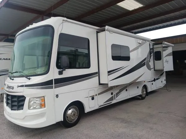 2018 Jayco Alante class A motorhome, model 31 P, super nice and clean, beautiful unit inside and out, only 16,946 mi on a Ford chassis, this 1 has 3 slides, 2 opposing in the living room, this unit will sleep 8 people: bed above the cab, hide a bed couch, booth dinette, and rear queen bed in a slide, big side kitchen with lots of counter space and lots of cabinets, 4 door refrigerator, split bath with big stand up shower, separate toilet, good for space and Good storage, rear bed slide with lots of closet and drawer space, 2 ducted air conditi 1 rs, Onan generator, Auto level, slide toppers, power awning, outside entertainment center, gel coat fiberglass exterior with like new decals, lots of outside storage compartments, and more! On sale $64,900, more pictures and information upon request, we welcome trades and offers, call or text Joe for your BEST deal, 830-660-7074, please call for information on other used and new units we have on the lot thanks.