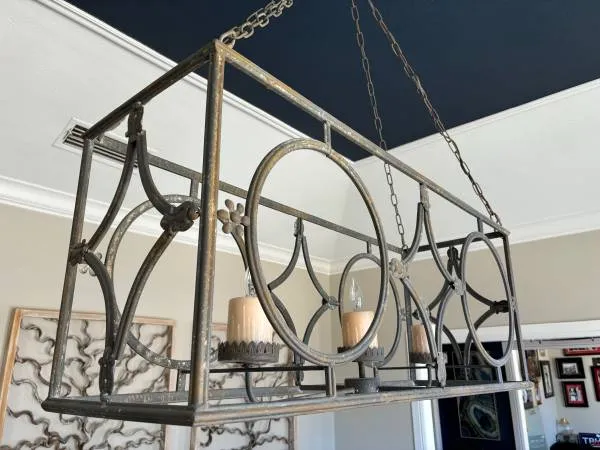 Selling this great unique rectangular cage dining room light. Light is made of metal with various colors of gray, beige and a little gold and really makes a statement in the dining room. In excellent physical and working condition with 3 lights. Measures 46 wide by 15 by 19 tall. Each of the chains are 40 long and light fixture is 34 from top to ceiling. Cash only, no gimmicks. Live in North Dallas. Please contact or text Scott at 972-978-0828.
