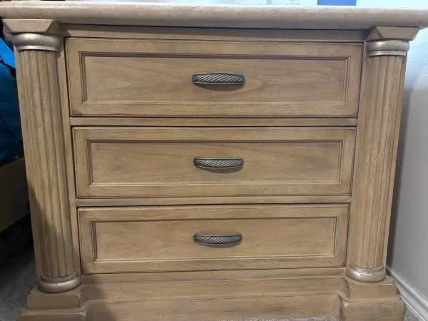 Selling this great oversized Drexel Heritage high end luxury nightstand in light oak with beige thick marble top. 3 Drawer very well built and in excellent condition. Paid over $1000 new. Live in North Dallas. Measures 37 wide 30.5 tall and 20.5 deep. Cash only, no gimmicks. Please text or contact Scott at 972-978-0828.