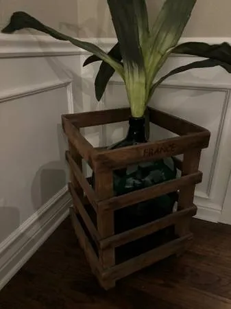 Selling this large green glass bottle in dark brown wooden crate. Crate is embossed with “France”. Measures 16 square by 21 tall. Green bottle is in the crate and all are in excellent condition. The plant insert can be thrown in. Live in North Dallas. Cash only, no gimmicks. Please text or contact Scott at 972-978-0828.