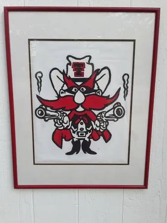 This Texas Tech mascot, Raider Red poster is from 1997. Its rare and in excellent condition. The over all size is 29 X 23 and the print is 20 X 16. Call David at 817-357-1773 if interested so we can set an appointment and please leave a voice message if I dont answer right away. No texting, I will Not reply. Im old fashi 1 d, I rather talk. Correct cash only and you pick up.