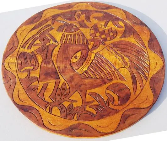 Please text me only on 281-818-0957 if you are interested in the items posted, serious buyer only, no call please. The dimensions: 19 in diameter, 3/4 in thickness 1 side is chess board The opposite site is the trial theme with 1 man and 1 giant bird