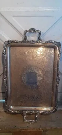 Beautiful antique silver plated serving tray. Approximately 22 × 17 without the handles. Not sure how old it is. WM Rogers engraved on backside. Sell for upto $250 onlinesee photos. Asking only $75. Call or text 508-809-0659