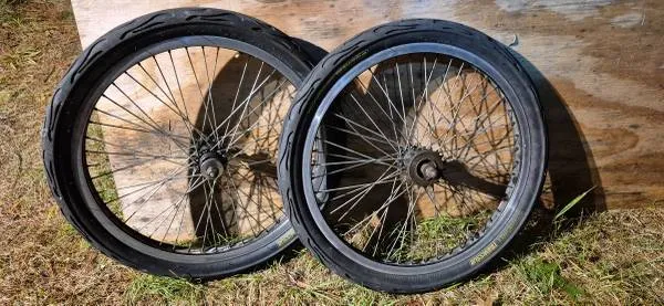 2 Mongoose alloy rims, front and rear, 20 × 2.15 with Mongoose hubs. Comes with freewheel, Mongoose Team Issue Kenda tires 20 × 2.0 and 2 tubes. Tires have great tread, wheels are true. Asking only $90 for set. Call or text 508-809-0659