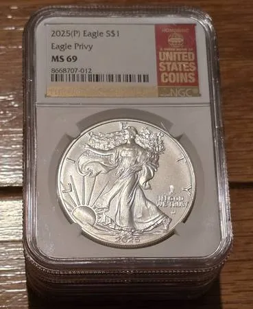🦅 2025-P American Silver Eagle – Eagle Privy 🇺🇸 ✔️ $75 each 🪙 1 oz Silver .999 Fine NGC Redbook Label Mint State MS 69 4 4 Available! 🔥 Limited 2025-P ASE with the Eagle Privy, all graded MS 69 by NGC with the Redbook label Great for collectors and investors 🚀 📲 Text at 726-241-7414 75 each cash 💸