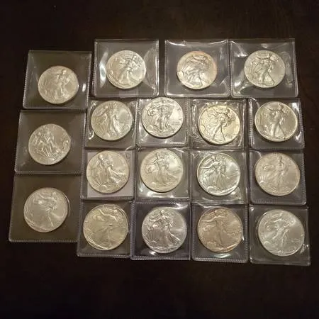 🇺🇸 18 American Silver Eagles – .999 Fine Silver 🦅 💰 $70 each cash or $1,250 for all 18 ~Selling 18, 1 oz, American Silver Eagles, all .999 fine pure silver from the U.S. Mint 🇺🇸 🪙 Brilliant Uncirculated Mint Stae Condition 🔥 👌 Years: 198719891990199119942000200120042005220072008201120162017201820242025 Open to trade for gold coins or bars 🤝 🔑Key words, gold, silver, bullion, coins, numismatic, precious metals, jewelry, currency, collectible, collection, dollar, stacker, hoard, m 1 y ☎️ Text at 726-241-7414 💰 $1,250 cash for all! $70 each