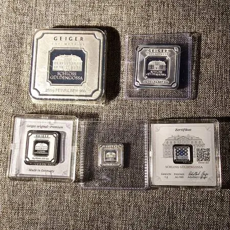 5-piece Geiger silver bar set ✨️ 🪙 Premium, authentic, and getting harder to find since tariffs have raised prices and delayed shipments. Includes: ✅️ 250 gram 8.03769 oz ✅️ 1 oz ✅️ 10 g ✅️ 5 g ✅️ 1 g All sold as 1 lot. Cash only. Geiger carries strong premiums and is sold out almost everywhere. First come, first served. ☎️ Text at 726-241-7414 $750 cash obo 💸