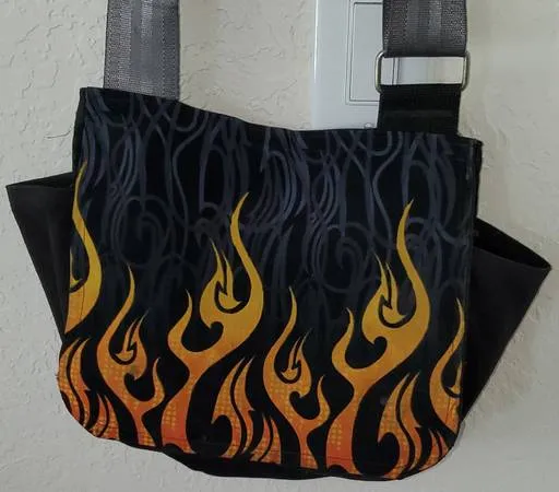 BLACK PURSE WITH FLAMING GOLD & ORANGE FLAMES ON FRONT OF PURSE 9 TALL x 11 WIDE WITH ADJUSTABLE SEAT BELT STRAP, THE STRAP RANGES FROM 14 SHORT TO 26 LONG THE FLAME SIDE THE FLAP OPENS UP WITH 2 SNAPS. THERE ARE 4 - FRONT POCKETS, 3 - PEN HOLDERS, 2 -SIDE POCKETS, 2 - INSIDE POCKETS. BACK SIDE OF THE PURSE, THERE IS 1 - BIG POCKET 405-413-8671
