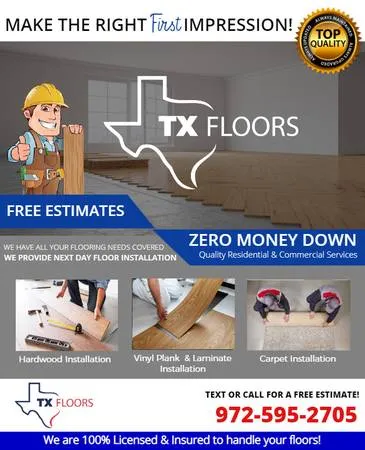 Now Offering Painting. 2-5 man crews Water proof flooring Laminate Wood Vinyl Carpet Tile Base boards Shoe molding Floor leveling Move furniture Demo. And haul off Free pickup and delivery of materials 30 years experience Not a Jack of all trades just an expert in flooring Free quotes Richard 972-595-2705 I have a real license and insured. And a valid LLC. That can be verified. Make sure you check. And dont pay anything upfront. I have accounts with almost all manufacturers. If you are interested in materials We can bring samples Next day installation available YOU PAY NOTHING TILL JOB IS COMPLETED TO YOUR SATISFACTION 9725952705 PLEASE BE CAREFUL ON CRAIGSLIST I HAVE BEEN GETTING MORE CALL THEN NORMAL ABOUT PEOPLE GETTING RIPPED OFF. OR GETTING HORRIBLE WORK. THE BEST WAY TO PROTECT YOURSELF..DO NOT PAY ANYTHING UPFRONT OR PAY ANYTHING TILL THE JOB IS COMPLETED TO YOUR SATISFACTION. IF THEY ARE PROFESSIONAL THEY WOULD BE ABLE TO WAIT TILL ITS COMPLETED. IF NOT YOU SHOULD ASK YOURSELF WHY Wood Floor, Wood Floor Install, Hardwood, Hardwood Flooring, Engineered Hardwood, Engineered Hardwood Flooring, Laminate, Laminate Flooring, Bamboo, Bamboo Flooring, Bamboo Flooring Install, Laminate Flooring Install, Engineered Flooring Install, Flooring Installation, Vinyl, Vinyl Plank, Luxury Vinyl Plank, LVP, Vinyl Flooring, Vinyl Flooring Install Dallas Plano Irving Fort Worth Richardson Addison Frisco Arlington Carrollton Southlake Lewisville Garland Mckinney Allen Coppell Denton Grapevine Grand Prairie Flower Mound Mesquite Bedford Rockwall Sunnyvale Hurst North Richland Hills Sachse Little Elm Keller Lancaster Burleson The Colony Cedar Hill Euless Wylie Colleyville Red Oak Prosper Weatherford Mansfield Farmers Branch Greenville Alvarado Aubrey Cleburne Waxahachie Farmersville Terrell Justin Duncanville Argyle Wilmer Anna Keene Italy Haltom City Roanoke Commerce Crowley Granbury Rainbow Tolar Krum Wolfe City Campbell Palmer Lipan Poolville Princeton Springtown Paluxy Aledo Melissa Crandall Millsap Alvord Scurry Rosser Glen Rose L 1 Oak Slidell Kennedale Forney Mabank Midlothian Lillian Sanger Haslet Azle Grandview Pilot Point Rowlett Kaufman Bridgeport Ennis Lake Dallas Decatur Seagoville Ponder Caddo Mills Godley Maypearl Dennis Josephine Naval Air Station/ Jrb Boyd Greenwood Avalon Westminster Ferris Paradise Nemo Whitt Elmo Joshua Royse City Quinlan Milford Merit Rhome Bardwell Weston Venus Rio Vista Celeste Copeville Kemp Celina Nevada Hutchins Cresson Trophy Club Peaster Newark Forreston Fate Lavon Blue Ridge Chico Desoto Services: Painting House Painter Exterior Painting Interior Painting Drywall Installation Drywall Repair Carpentry Decks Door Installation Door Repair Fence Fixing Fencing Fences Fence repair Gutter Cleaning Gutter Repair Handy man Siding Vinyl Siding Window Repair Window Replacement Window Installation Windows Room Additions Home Repairs Remodeling Painters Window & Repair House painting House painters Home painting Painting contractors Interior painter Exterior painter Bathroom remodeling Kitchen remodeling Kitchen Remodeler Sun Rooms Renovations Carpenter Wood working Cabinet Painting Shingles Interior House Painters Interior Wall Painting Exterior House Painters Professional Painters Home Painting Services Home Painters House Painting Services Residential Painters Professional Painter Interior Home Painting Residential Painting Contractors House Painting Companies Exterior Painting Service Exterior Painting Companies Outside House Painters Outside House Painting Painting - Faux Finishes Paint Removal Paint Stripping Paint Trim Cabinet Painting Contractor Exterior Painting Interior Painting Interior Painters Painting Services Vinyl plank We service Dallas and its surrounding neighborhoods: Dallas, DALLAS, Bent Tree, Bluffview, Casa Linda, CENTRAL DALLAS, Deep Ellum - Expo Park, Design District, Devonshire, Downtown, EAST DALLAS, Eas 2 od, FAR NORTH DALLAS, Forest Hills, Greenway Parks, Highland Park, Hillside, Hollywood H 8 s - Santa Monica, Kies 2 od, Lake Highlands, Lake Park Estates, Lakewood, Lakewood H 8 s, Little Forest Hills, Lochwood, Love Field, Lower Greenville, M Streets - Vickery Place, Medical District, Midway Hollow, Mount Auburn, NORTH DALLAS, North Oak Cliff, Northaven Park, NORTHEAST DALLAS, NORTHWEST DALLAS, Northwood Hills - Valley View, OAK CLIFF, Oak Lawn, Old East Dallas, Old Lake Highlands, PARK CITIES, Pleasant Grove, Preston Highlands, Preston Hollow, Preston Trail, Prestonwood, Ridgewood Park, South Dallas/Fair Park, SOUTHEAST DALLAS, SOUTHWEST DALLAS, The Peninsula, University Park, Uptown, WEST DALLAS, Wilshire H 8 s, Casa View, Glen Abbey, Beckley Club Estates, Fort Worth, Ranchette Estates, River Trails, Eastern Hills, Western Hills, Arlington H 8 s, Wedgwood, Hulen Springs Meadow, Far Southwest, Bluebonnet Hills, University Place, Berkeley Place, Ridglea Hills, Ridgmar, Historic Southside, Haltom City, River Oaks, Wes 2 rth Village, White Settlement, Benbrooks, Edgecliff Village, Forest Hill, Kennedale, Burleson, Lake Worth, Melody Hills, North Richland Hills, Wautauga, Hurst, Bedford, Colleyville, Euless, Pantego, Dalworthington Gardens, Mansfield, Southeast SE Arlington, East Arlington, Grand Prairie, Keller, Roanoke, Grapevine, Flower Mound, Irving, Coppell, Denton, Corinth, Highland Village, Cross Roads, Little Elm, Carrollton, Lewisville, The Colony, Addison, Farmers Branch, Frisco, Proper, McKinney, Fairview, Allen, Plano, Lucas, Murphy, Wylie, Rowlett, Garland, Richardson, University Park, Duncanville, Cedar Hill, Midlothian, DeSoto, Red Oak, Lancaster, Hutchins, Balch Springs, Mesquite, Sunnyvale, Melissa Plumbing Plumbers Appliance installations Water Heater Installation Garbage disposal repair or replacement Kitchen Sink Kitchen faucet repair or replacement Sewage system Water heater repair or replacement Faucet Installation Faucet pressure Drain Clogs Rooter Water Heater installation & Repair Pipe Installation Toilet & urinal rep