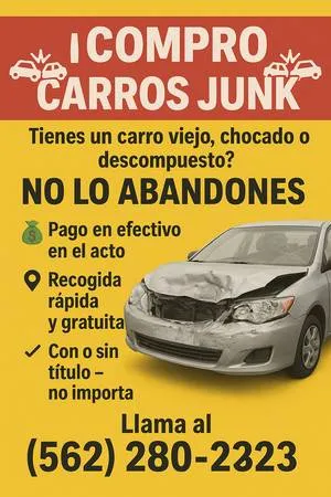 We buy junk Cars Running or Not. We Pay Top dollar. Same Day Pick up. we Buy any Year, Cars, Sports Cars. We Buy Any Junk Car 323-975-3532. SE ABLA ESPANOL ..COMPRAMOS TU CARRO CON O SIN PAPELES$ SERVICIO RAPIDO GRUA INCLUIDA EN CUALQUIER CONDICIN ANOS O MARCAS SERVICIO AMABLE SI TIENES UN CARRO NO LO NECESITAS LLAMANOS TE PAGAMOS EN EFECTIVO HONDAS TOYOTAS ACURAS LEXUS Y MAS SI CAMINAN Y SON MEJOR ANO TE PODEMOS MEJORAR EL PRECIO 323975-3532