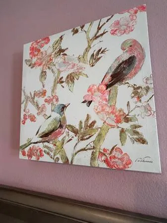 2 canvas art paints are signed by “de Villeneuve”. 2 birds perched on flowering branches, cherry blossoms. These 2 canvas art painting are sure to complement any room wall decor. 20 x 20 x 2.5. Call: 619-569-9995. No email.