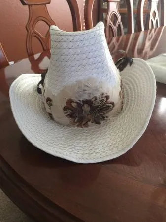 Beautiful white hat with feather design. Size 6.1/2. Brand new. In perfect condition. Call: 619-569-9995.
