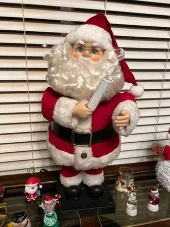 24 high. Animated vintage Santa, letting guests, family enjoy this moving animated Santa during Christmas, lighted candle figure, arm movement and singing variety Christmas songs by turn on/off switch connected plug. In perfect working condition. Call: 619-569-9995.