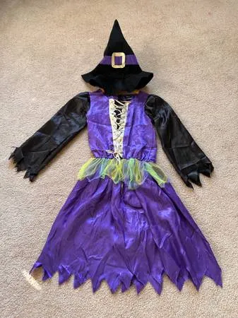 Size 7-10. 2 pieces girl Halloween costume. Wicked witch dress and the hat. In perfect new condition. Price: $5 for the complete outfit. Call: 619-569-9995.