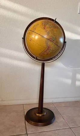 34 tall on wooden stand with round metal base. It includes details of. Countries, continents, natural resources, landmarks and political boundaries. The globe has a full tilting and rotating metal axis for easy viewing. Call: 619-569-9995.