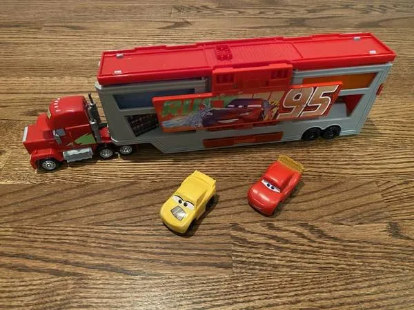 DISNEY PIXAR MACK PAINT SHOP TRUCK Mack with Detachable Cab, Lightning McQueen CAR CARRIER HAULER with 2 Cars Excellent Condition Comes with what is in the pictures Pick up 192 nd & Harrison area Text 402-889-5046